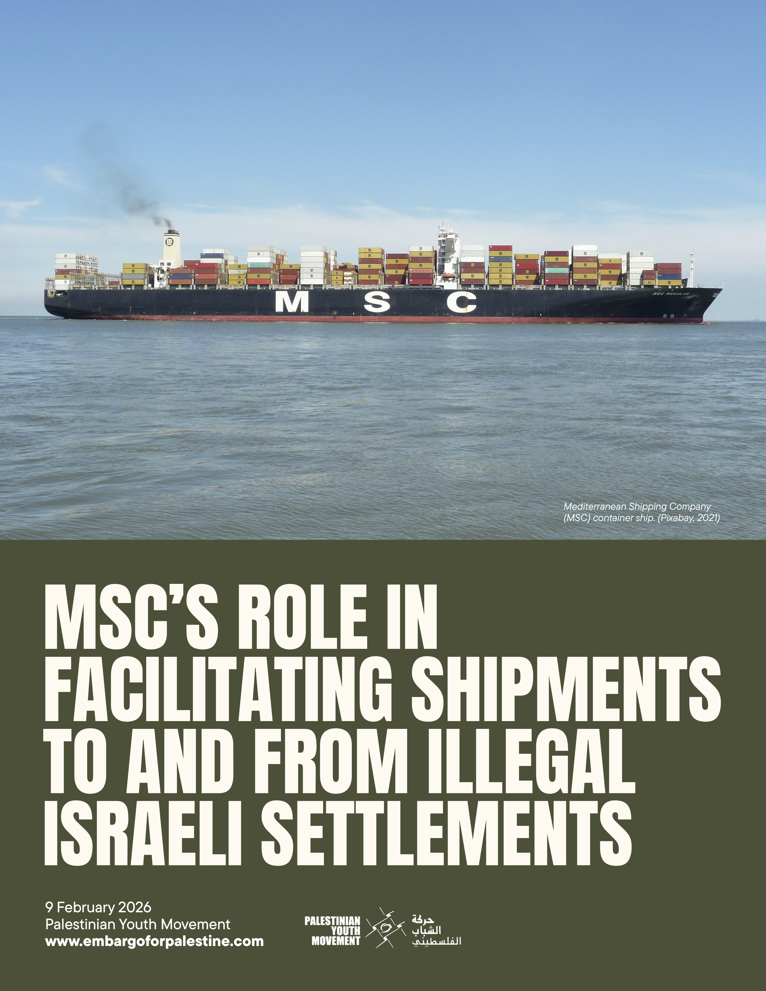 This report exposes the role that Mediterranean Shipping Company (MSC) plays in facilitating shipments to and from illegal Israeli settlements. By facilitating settlement trade, MSC is actively supporting companies involved in the preservation and advancement of illegal settlement economies and infrastructure that are in violation of international law.
